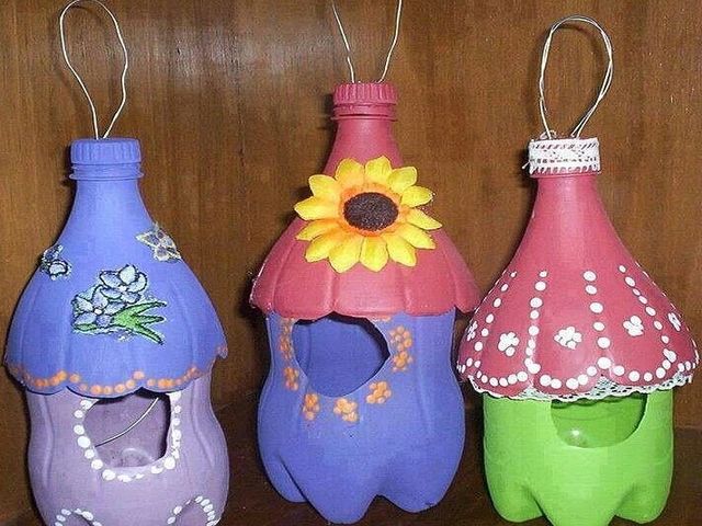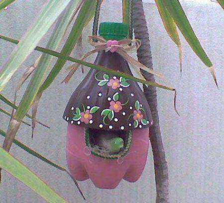 В детском саду очень любят проводить различные экологические акции, например, покормить птиц. Для чего организуют конкурсы кормушек. Пластиковые бутылки очень хорошо подходят для такой цели. Конечно, можно просто вырезать отверстие в такой бутылке и повесить ее на дерево. Но, если подойти к данному вопросу творчески, то можно получить и такую вот поделку.