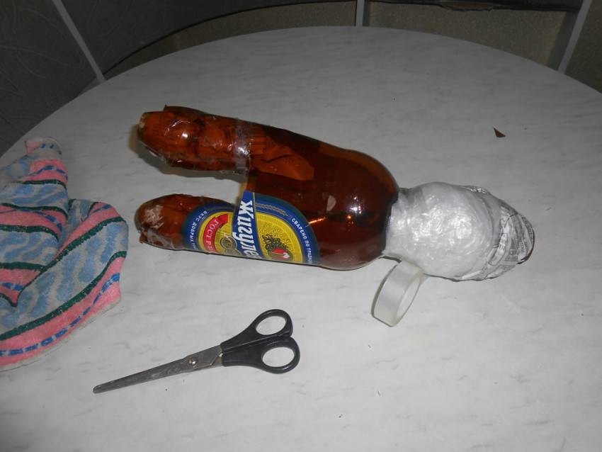 - Сформировать корпус поделки. Из литровой тары сделать шею животного. На место мордочки приклеить стакан.