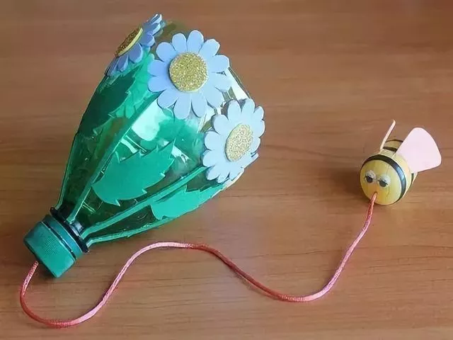 Здесь нам понадобится верхняя часть бутылки, т.е. горлышко. Разрезаем бутылку пополам. Низ используем для чего-нибудь другого, например для выращивания рассады. Бутылку разрисовываем или делаем аппликацию, как на рисунке. К пробке приделываем длинную веревочку. К другому концу этой веревочки привязываем пчелу, которую делаем из бутылочной пробки. Игрушка готова. Подбрасываем вверх пчелу и ловим ее бутылкой-стаканчиком, держа ее за горлышко.