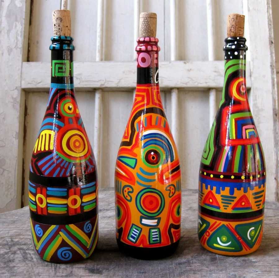 Расписанная бутылка может превратиться в вазу, графин или кувшин – в зависимости от ее размера и формы. Перед началом работы ее нужно чисто вымыть и продезинфицировать, внешнюю поверхность обезжирить и загрунтовать. Лучше всего в качестве основного тона подходят белый, черный и синий цвета.