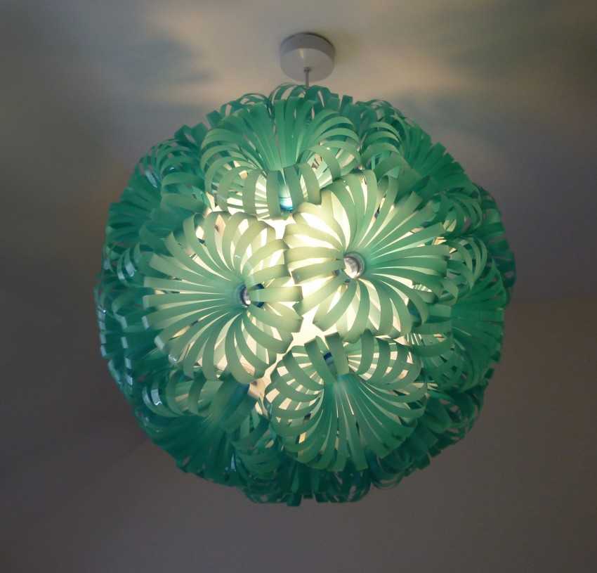 Обзаведитесь шикарной люстрой, из стеклянных бутылок, для брутального помещения. Придется какое-то время собирать и хранить емкости разных оттенков, но результат достойный.