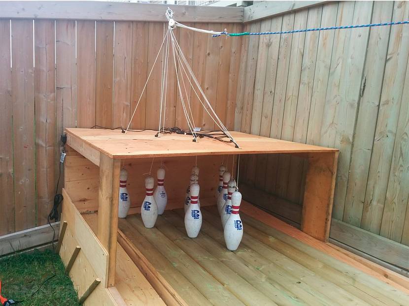 Неплохая идея обустроить боулинг на даче в виде деревянной конструкции с кеглями. Чтобы выставить все их в нужном порядке, достаточно просто потянуть за шнурок и приподнять каждую деталь.