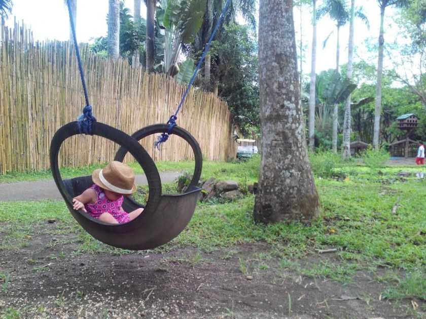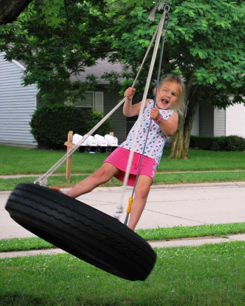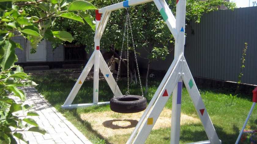 Готовые поделки из колес для сада в виде качелей вешаются на прочную толстую ветвь (подойдет орех, груша, дуб). Но лучше вместо естественной «перекладины» использовать металлический аналог.