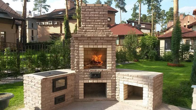 Построенная из блоков барбекюшница, оформленная декоративным камнем, представляет собой небольшую кухню. В ней обустраивается печка с поддувалом, место под открытый огонь с емкостью для сбора пепла, а также свободные ниши под всякие мелочи.