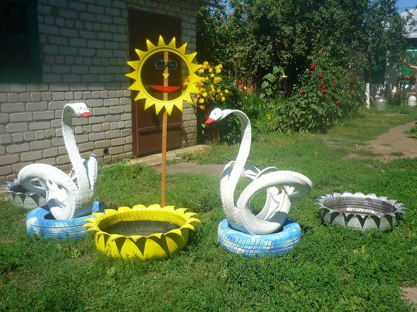 Клумба-лебедь отлично подчеркивает общий стиль садового участка. Поделки из шин для сада – отличная задумка для тех, у кого есть доля терпения, фантазия и скопившиеся старые покрышки.