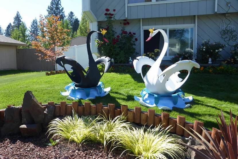 Лебеди – это излюбленный вид поделки многих дачников. Они эффектно смотрятся на участке. Делать их немного дольше, чем пуфик или кресло.