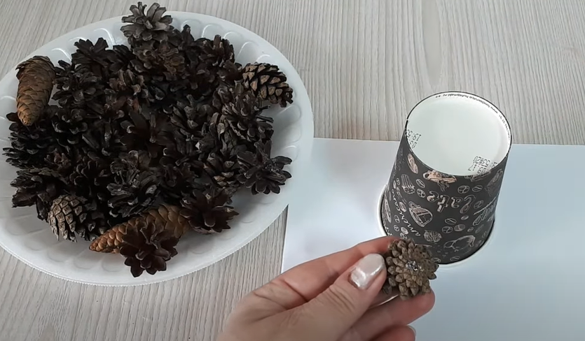Для основы используем обычный бумажный или пластиковый стаканчик, который переворачиваем и по кругу ряд за рядом обклеиваем его небольшими сосновыми шишками.