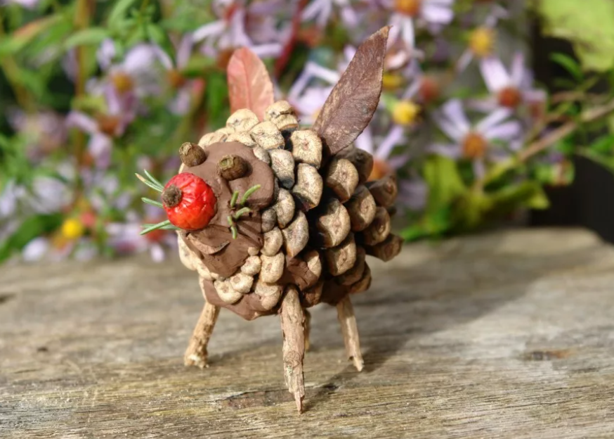Интересным элементом для детского творчества являются шишки и желуди. Их форма может быть использована для туловищ и других крупных деталей. В конце лета и осенью собирайте дары природы по время семейных прогулок по лесу, чтобы потом сооружать интересные фигурки и композиции: