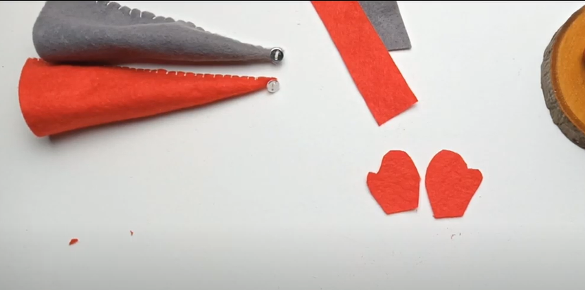 - Для колпачка используем красный фетр, из которого вырезаем треугольник и сшиваем прямо по лицевой стороне.