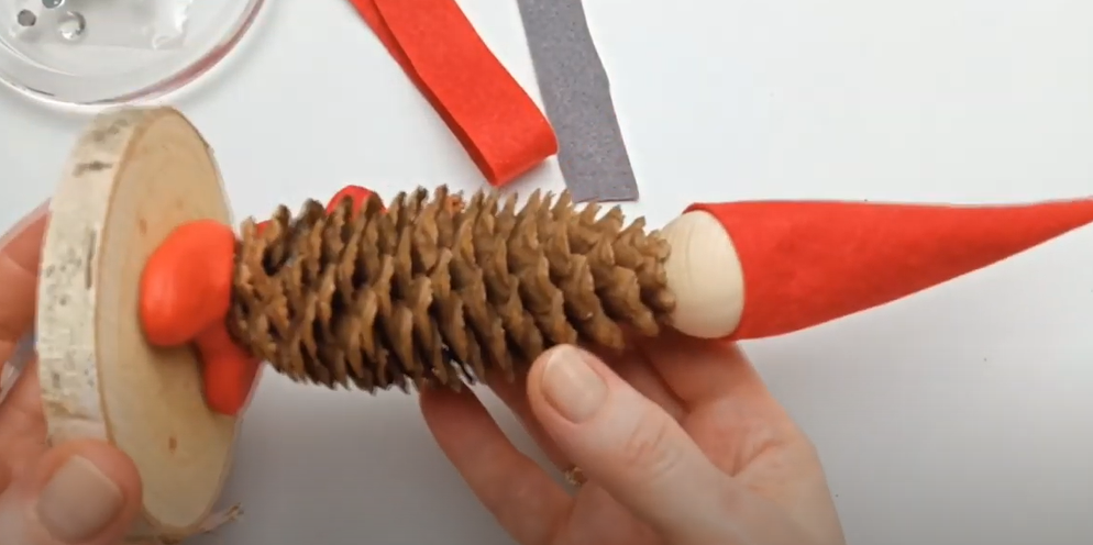 Как только пластилин будет плотно прикреплен к шишке, оттягиваем его. В результате получаем вытянутый нос.