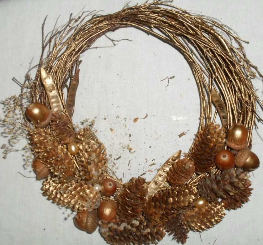 - Шишки обвязывают проволокой посередине и делают из них замкнутый круг. Таких заготовок надо не меньше трех. Размер каждого круга напрямую зависит от общего количества шишек. Оптимальное количество шишек около 15 на один круг.