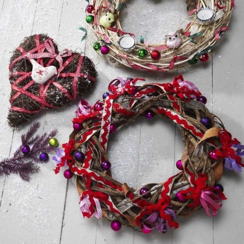Ярким представителем новогодних поделок из веток являются ёлочные шары. Для их изготовления лучше использовать свежие берёзовые или ивовые прутики. В качестве декора подойдут ленты из домотканой ткани.