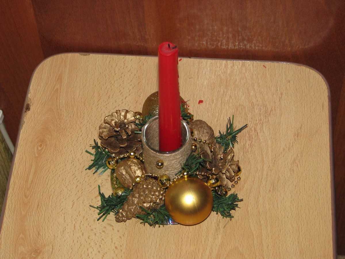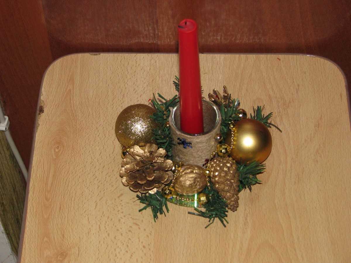 Пошаговое изготовление поделки своими руками практически закончено, для этого необходимо вставить свечу по середине стакана и закрепить ее там, чтобы она не болталась. Помните, что свеча не должна быть выше стакана, так будет и безопасно, и выглядеть будет более аккуратно.