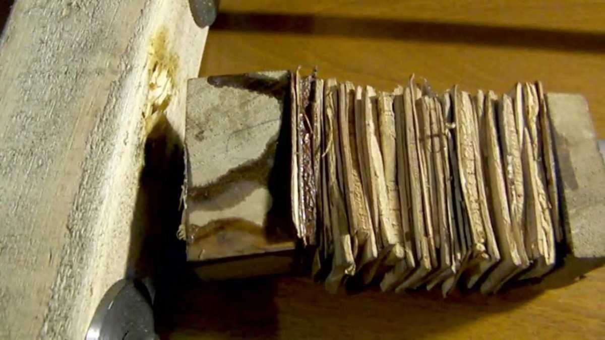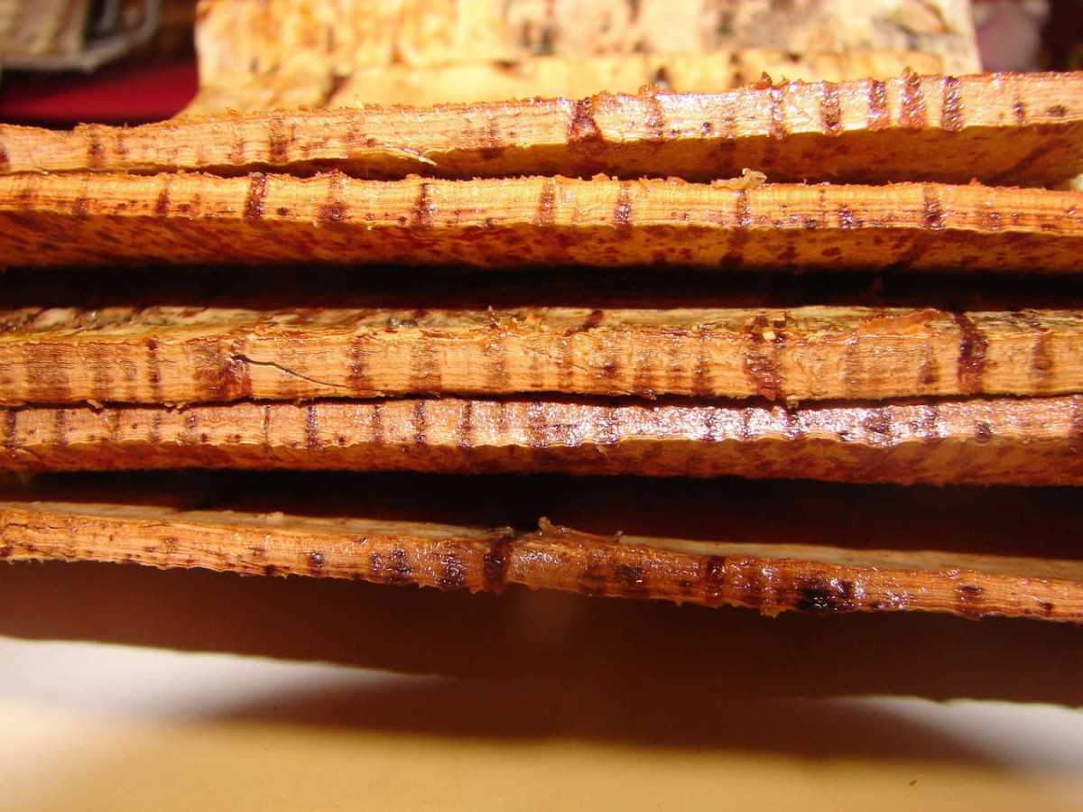 Дальнейшим этапом является сборка в стопку с аккуратной выкладкой листов с чередованием внешних и внутренних частей коры. В домашних условиях производится расщепление на тонкие пласты. Сделать это надо быстро, не давая высохнуть заготовкам.