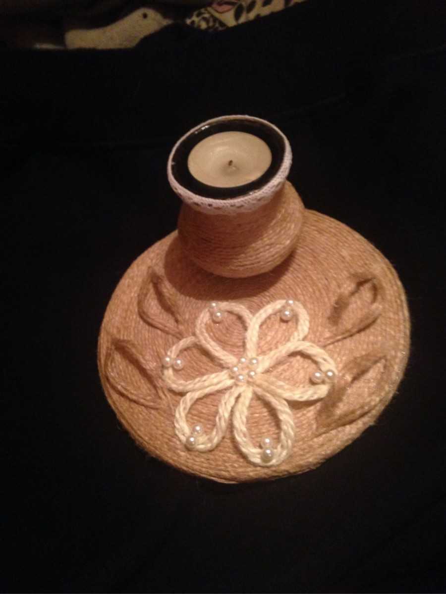 – это тонкая нить, скрученная из волокон. Данным предметом можно украсить много вещей, в том числе вазу для цветов своими руками. Достаточно приклеить шпагат на дно емкости с помощью клея и дальше наматывать ее по изделию вверх.