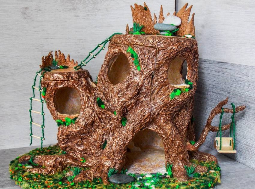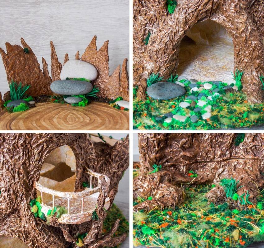 За основу можно взять необычную корягу или старый пенёк. Обязательно вырезать дверь и окошки. Крышей может стать все: опавшие листья, кусочки мха, висячие грибы, осколки глиняных горшков, палочки от эскимо для черепицы. Из соленого теста получается отличный строительный материал для крыльца, заборчиков и др.