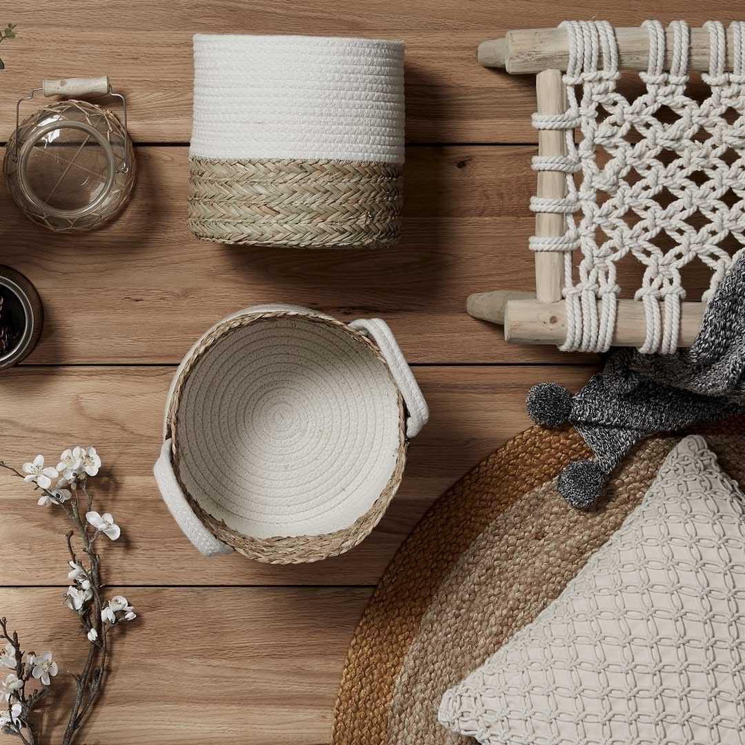 . Пальмовым волокном обматывают любые емкости (стеклянные, пластиковые, фарфоровые). Крепить бечевку лучше на строительный клей.