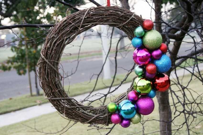 Оригинально будет смотреться рамка, наподобие рамки для фотографий, сделанная из тонких веток, связанных между собой. Вместо фото в ней будет висеть красочный новогодний шарик.