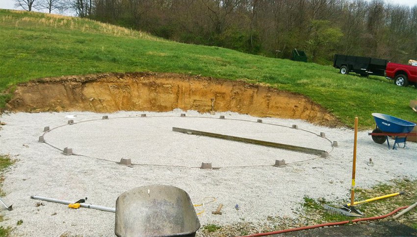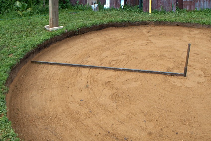- Круглый. Там, где должен быть центр резервуара, вкопайте кол в землю и привяжите к нему длинную веревку. Наклейте краску в воздушный шарик на его второй конец, затем нарисуйте круг. Вместо рисования можно взять бутылку с песком и разметить ею границы. Или привяжите к свободному концу веревки заостренную палку и нарисуйте круг на земле. Другой вариант — просверлить землю и установить больше колышков на месте проколов, натянув между ними веревку.