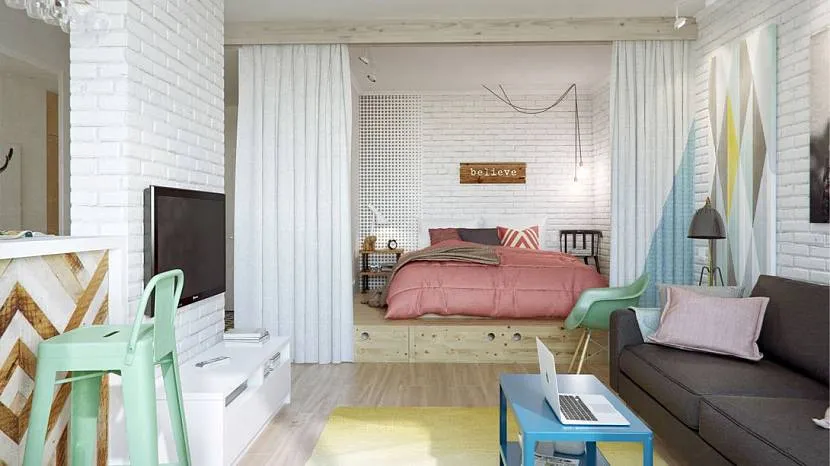 При наличии маленькой спальни симпатичное решение – подиум, внутрь которого прячутся спальные места. Сверху получится поставить любую другую мебель, а на ночь из-под конструкции будет появляться удобная двуспальная кровать.