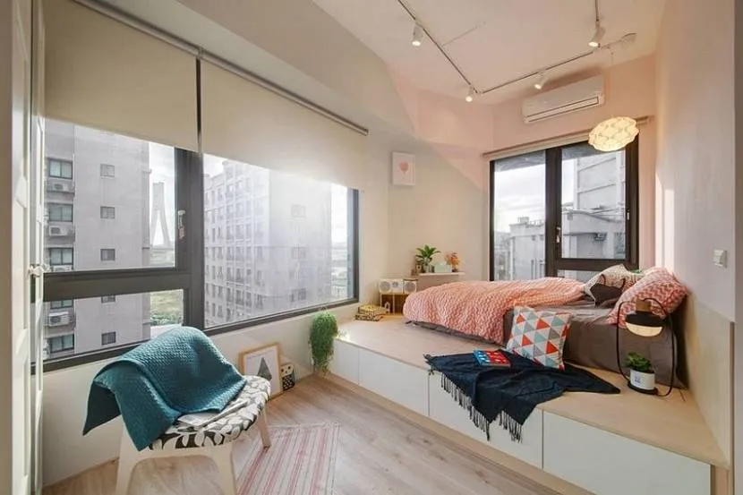 - Оборудование подоконника под подиум. Одно из выгодных решений, которое позволяет разместить кровать под большим окном. Есть множество различных вариантов размещения установки.