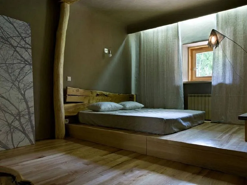 Никакая мебель из IKEA не сравнится с тем, что можно сделать своими руками. Натуральное дерево, шторы и покрывало одного стиля, материала и оттенка. Потрясающая гармония, способная успокоить и отвлечь от городской суеты. Завершающим элементом выступает небольшое окно, пропускающее минимум солнечного света и приглушенное освещение, создающее некий интим.