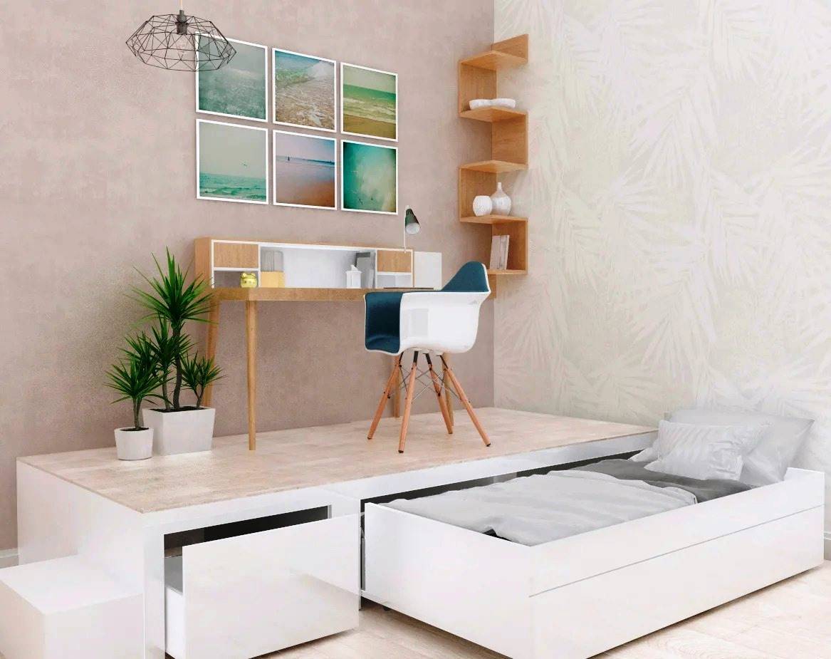 - мобильная – представляет собой помост с системами хранения. Ночью на него кладут матрас и постельное, днем – убирают, используя пространство в других целях;