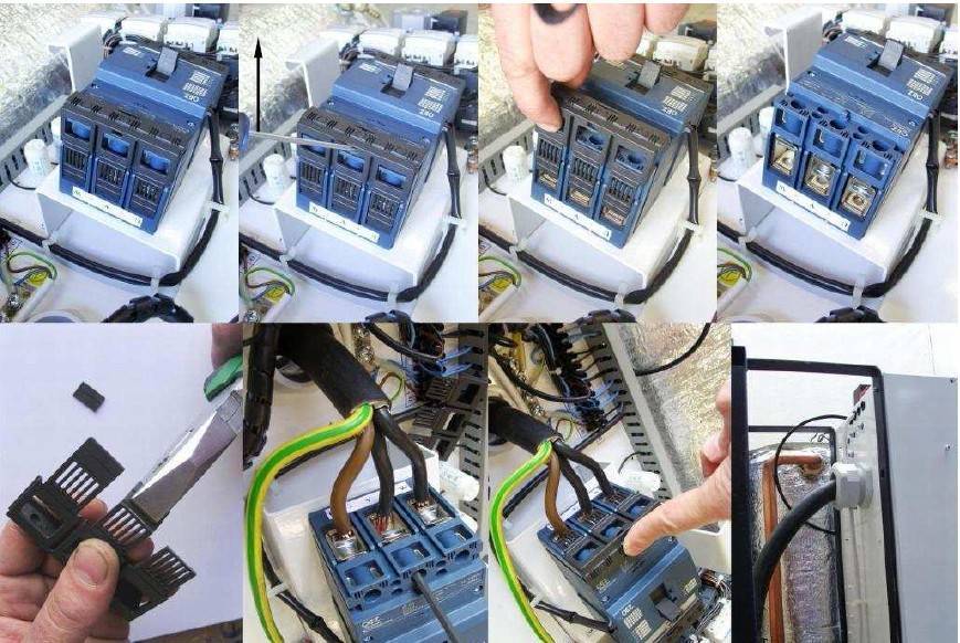 Шаг 3: теперь для всех УЗО следует объединить питание, установив гребенку. Причем винты первого УЗО не следует затягивать. Далее необходимо взять отрезки кабелей 10 квадратных миллиметров, снять с концов изоляцию, сделать опрессовку наконечниками, после чего соединить рубильник с УЗМ, а УЗМ с первым УЗО.