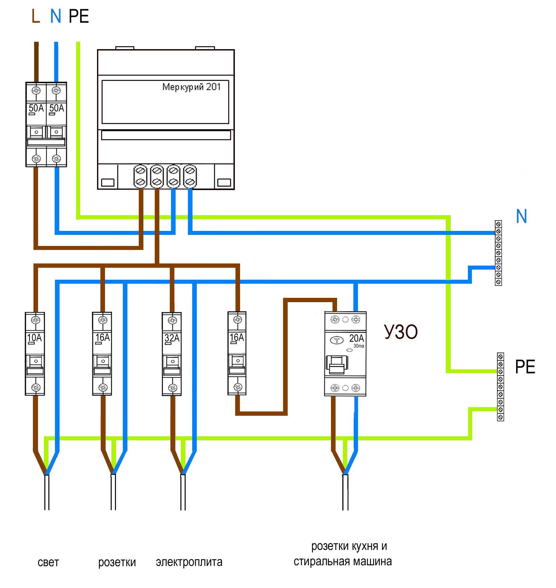 При такой схеме устанавливается одно УЗО для обеспечения защиты одновременно всей квартирной проводки.