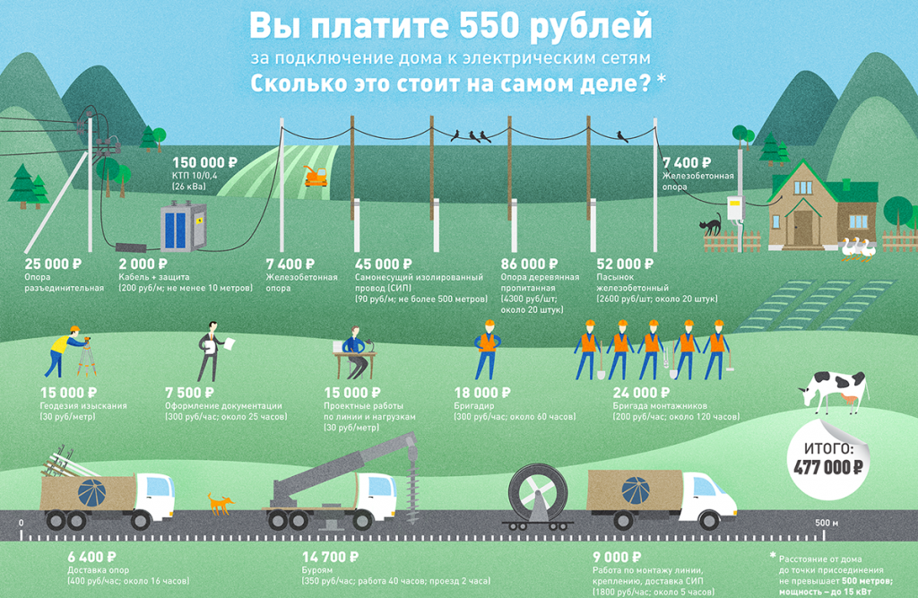 Однако 550 рублей – это стандартная стоимость подключения физических лиц, использующих до 15 кВт для бытовых целей, при условии, что ближайшая распределительная станция или электроопора находится в радиусе 300 (500) м от их участка. Указанная сумма распространяется на всех потребителей, которые подпадают под эти условия.