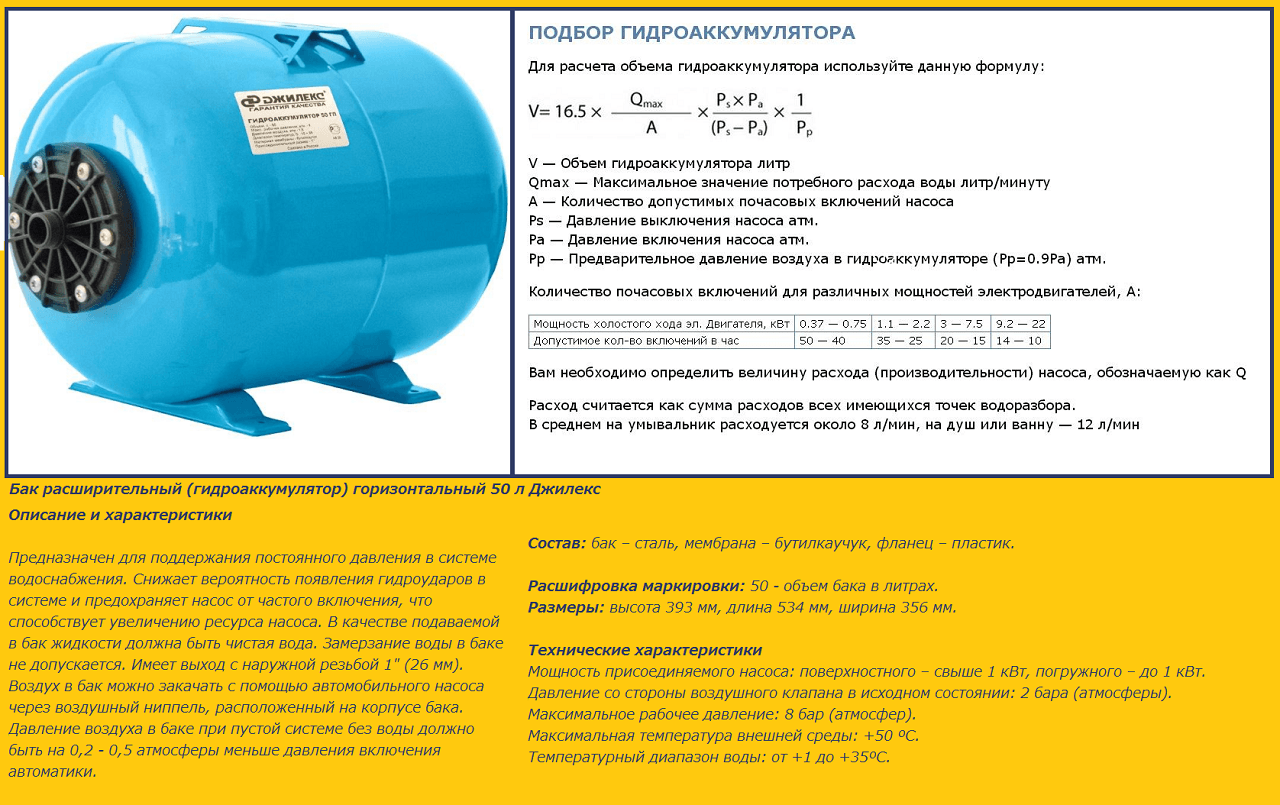 Слишком малая емкость неэффективна, так как насос будет включаться часто, что неблагоприятно сказывается на сроке службы. Для расчетов применяется специальная формула. В качестве альтернативного метода определения требуемого объема бака используют соответствие мощности насосной станции и размера емкости. Больше производительность – больше размер бака.