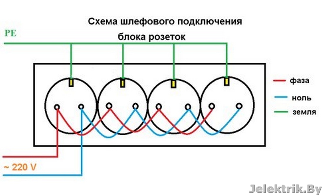 Важное замечание! Соединение розеток шлейфом допустимо только в том случае, если гарантирована целостность нулевого защитного проводника РЕ. То есть каждая розетка подключается к сети заземления не шлейфованием, а отдельным ответвлением