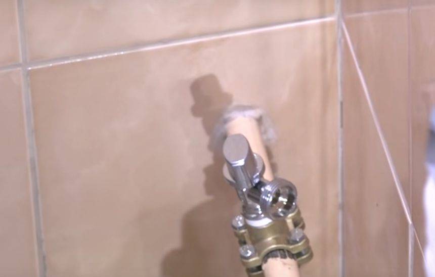 1. Вырезаем сквозное отверстие в стене для вставки крана. Для этого лучше всего использовать электродрель. После закрываем неровности плиткой. С другой стороны вырезаем отверстие в трубе (как в случае с установкой муфты) и прикручиваем переходник.