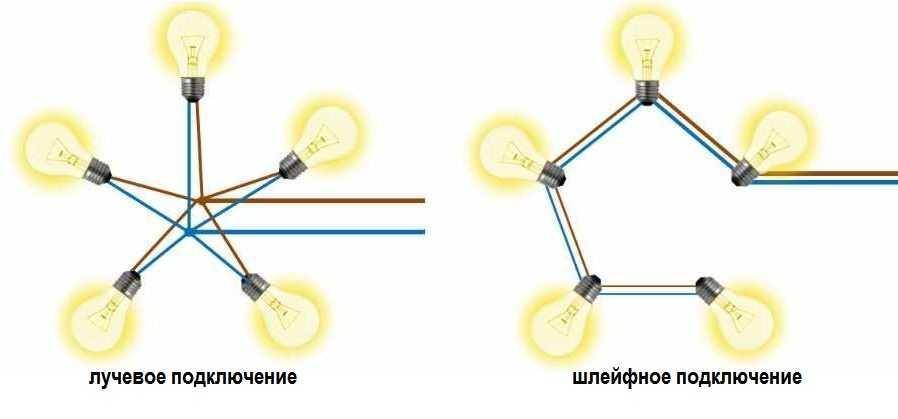 Параллельное подключение светильников на потолке может быть двух типов — лучевым или шлейфным. Каждый из этих типов имеет свои недостатки и преимущества.
