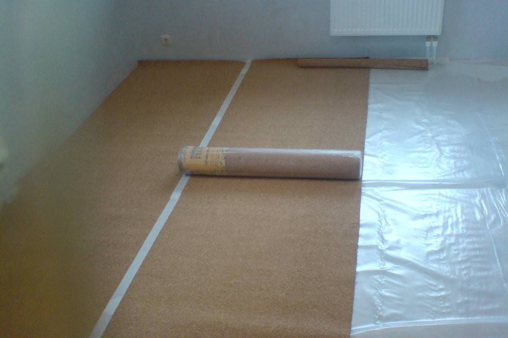 Нарезать материал основания можно ножницами либо резаком, а для нанесения линий замеров достаточно использовать карандаш и линейку. На цементный или бетонный пол, особенно при использовании пробковой подложки, обязательно надо подложить полиэтиленовую пленку. Такая двойная защита необходима для гидроизоляции пола, особенно если ваша квартира расположена на первом этаже и имеется подвальное помещение.