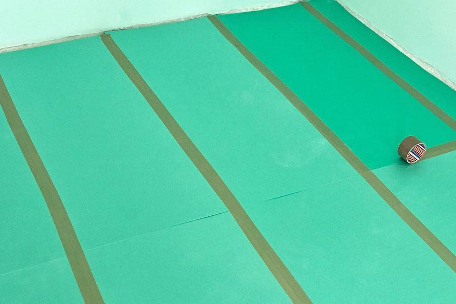 После укладки соседних кусков прокладочного материала, их скрепляют малярным или специальным строительным скотчем по стыкам. Таким образом получается цельное полотно, устойчивое к временным воздействиям при монтаже ламелей напольного покрытия.