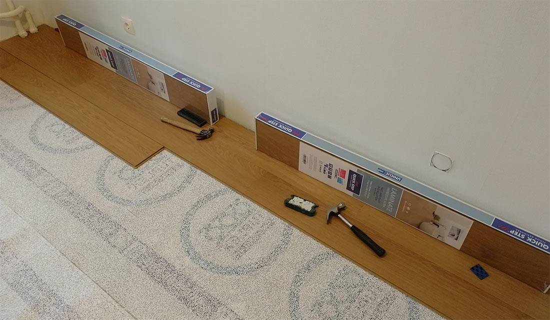 На подготовленный пол настилается подложка, а затем укладывается ламинат