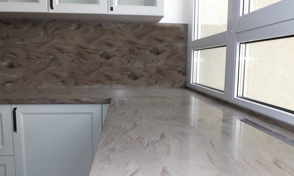Подоконник столешница из акрилового камня состоит из смолы, наполнителя, красителя, чаще всего имитирует природный материал. Готовая доска гладкая, без швов, простая в обработке. Акрил не впитывает жир и влагу, служит долго.