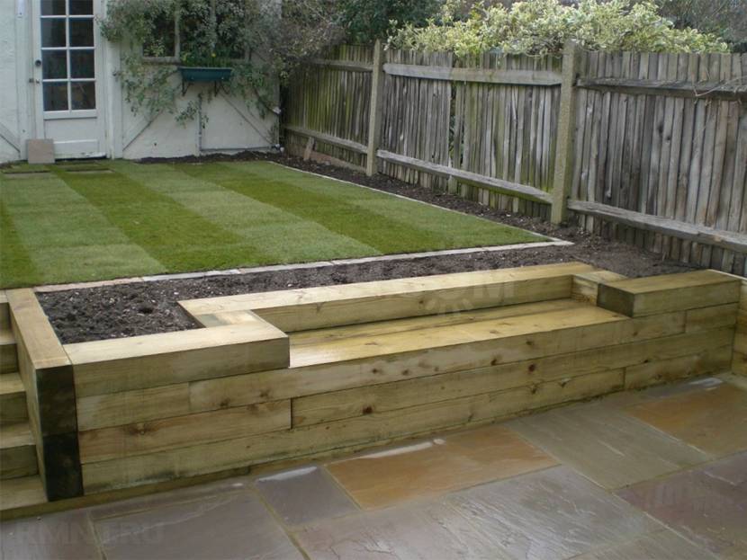 Бетонные стенки просты в создании, с их помощью можно легко делать кривые, углы и даже лестницы, тем самым разнообразя свой участок. Бетон можно отделать разными материалами, а в уходе он неприхотлив. Он не выделяет вредных веществ и доступен для строительства.