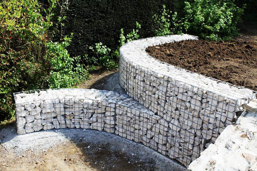 В последнее время конструкции из габионов часто используют для ограждения частной территории или же при создании архитектурно-декоративных элементов. В основу конструкции входят блоки из проволоки наполненные камнями. Стоит отметить, что в этом случае нет необходимости обустраивать фундамент, но для больших конструкций необходимо дополнительное крепление. Все блоки скрепляются между собой оцинкованной проволокой. При закладке камней декоративные и красивые элементы укладывают с лицевой стороны. Остальной объем может быть заполнен более простыми камнями: