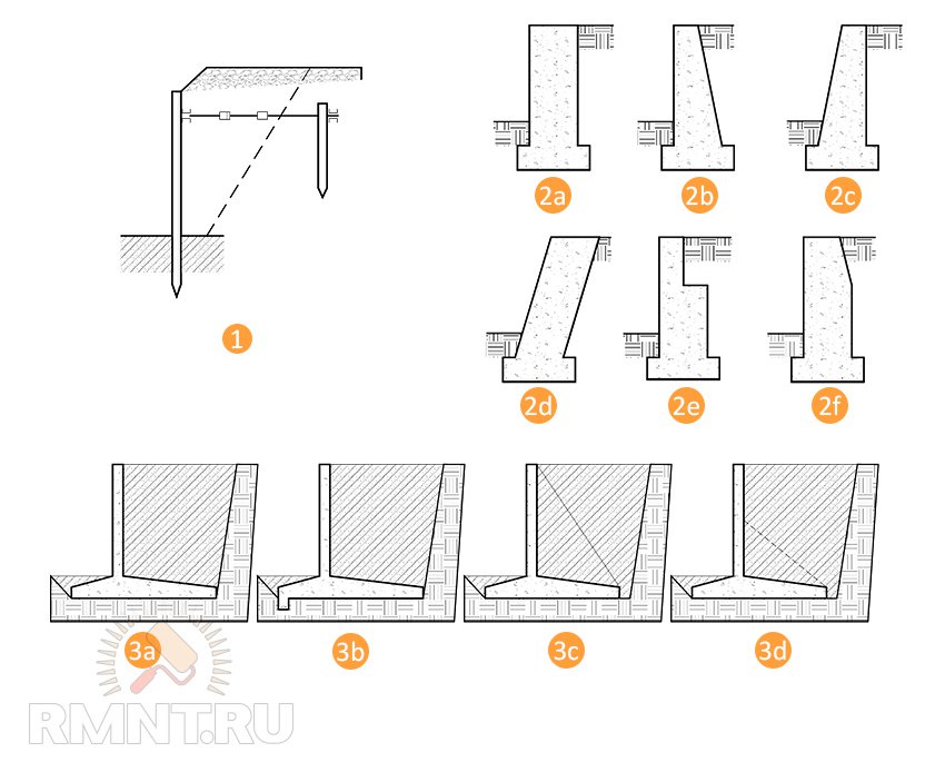 1. Гибкая подпорка с анкерным прекплением. 2. Массивные подпорные стенки: а — с вертикальными гранями; b — с вертикальной лицевой и наклонной тыльной гранью; c — с наклонной лицевой и вертикальной тыльной гранью; d — с двумя наклонными в сторону насыпи гранями; e — со ступенчатой тыльной гранью; f — с ломаной тыльной гранью. 3. Тонкостенные подпорные стенки: a — уголковая консольная; b — уголковая консольная с зубом; c — уголковая контрфорсная; d — уголковая с анкерными тягами