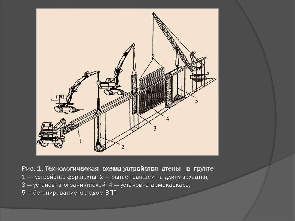 Чтобы предотвратить осыпание верхнего слабого грунта, стенки форшахты укрепляют. После этого при помощи крановых или экскаваторных грейферов производят выборку почвы из траншеи на необходимую глубину вплоть до нескольких десятков метров.