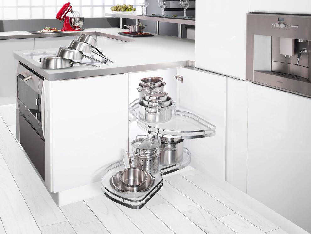 Прекрасным решением для угловых шкафов стали выдвижные системы Le Mans и Magic Corner. Они позволяют полностью использовать пространство углового шкафа. Вращаясь они полностью выдвигаются наружу, обеспечивая лёгкий и быстрый доступ к содержимому. Альтернативой меньшего размера являются круглый полки, которые не выдвигаются вперед, но вращаются вокруг своей оси.