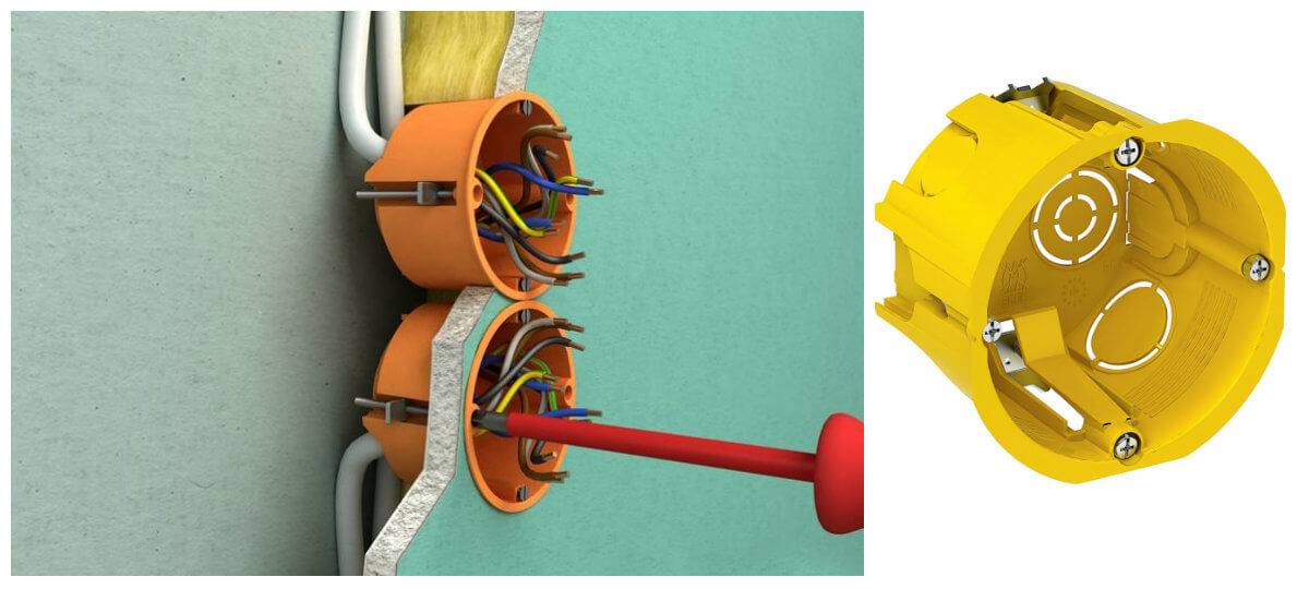 Монтажная коробка, которая устанавливается в гипсокартон отличается от стандартной модели в разы, а также обладает рядом преимуществ, которые позволят разместить конструкция в практически полой стене.