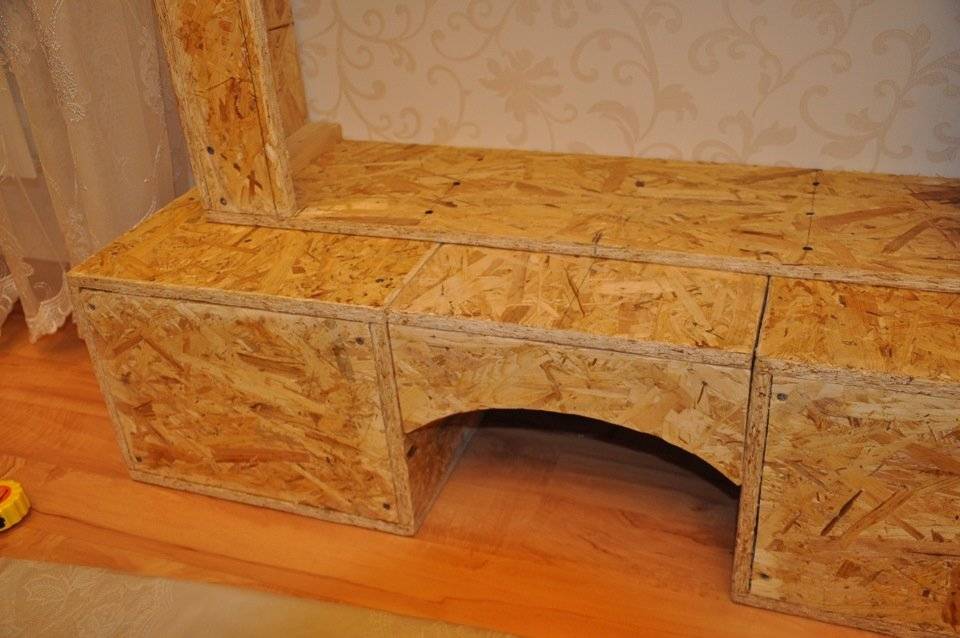 Прессованные плиты из шпона и отходов лесообработки по прочностным характеристикам вполне подходят для изготовления портала электрокамина. Однако непрофессиональный раскрой листов приводит к разрыхлению волокон на торцах, что несколько усложняет обшивку каркаса мелкими элементами. К недостаткам относится токсичность фенольных и формальдегидных смол в их составе, но после отделки воздухонепроницаемыми материалами вопрос вредного воздействия на человека снимается.