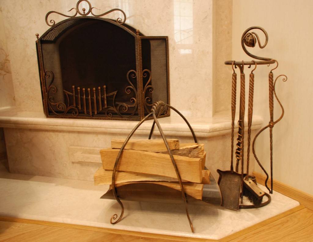 Если камин, установленный в доме, является действующим, тогда вам не обойтись без различных щеток, кочерги, щипцов, с помощью которых довольно удобно переворачивать дрова, совок, и конечно стойка для всех этих приборов и дровница. Кованая мебель, расположенная в гостиной будет идеально сочетаться с камином.