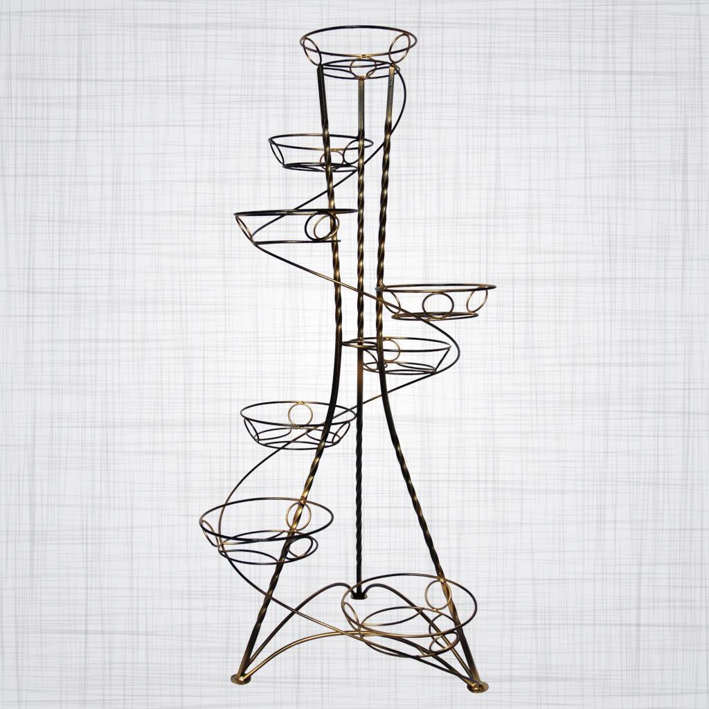 Металлические стойки для цветов могут полностью состоять из стали или использоваться в сочетании с деревом, стеклом или МДФ. Полностью металлические конструкции особенно впечатляюще получаются в технике ковки, когда можно придать им замысловатую форму и украсить множеством декоративных элементов.