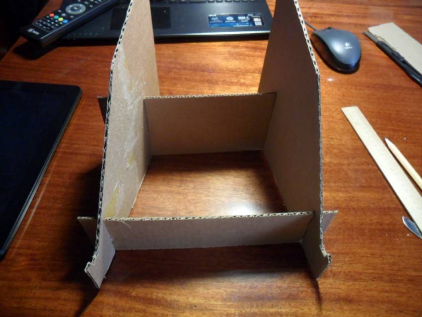 Если дома остался старый подкассетник, очень просто создать удерживающую конструкцию: откройте его максимально назад, чтобы часть с карманом для кассеты осталась спереди, а верхняя крышка подкассетника разместилась на столе.