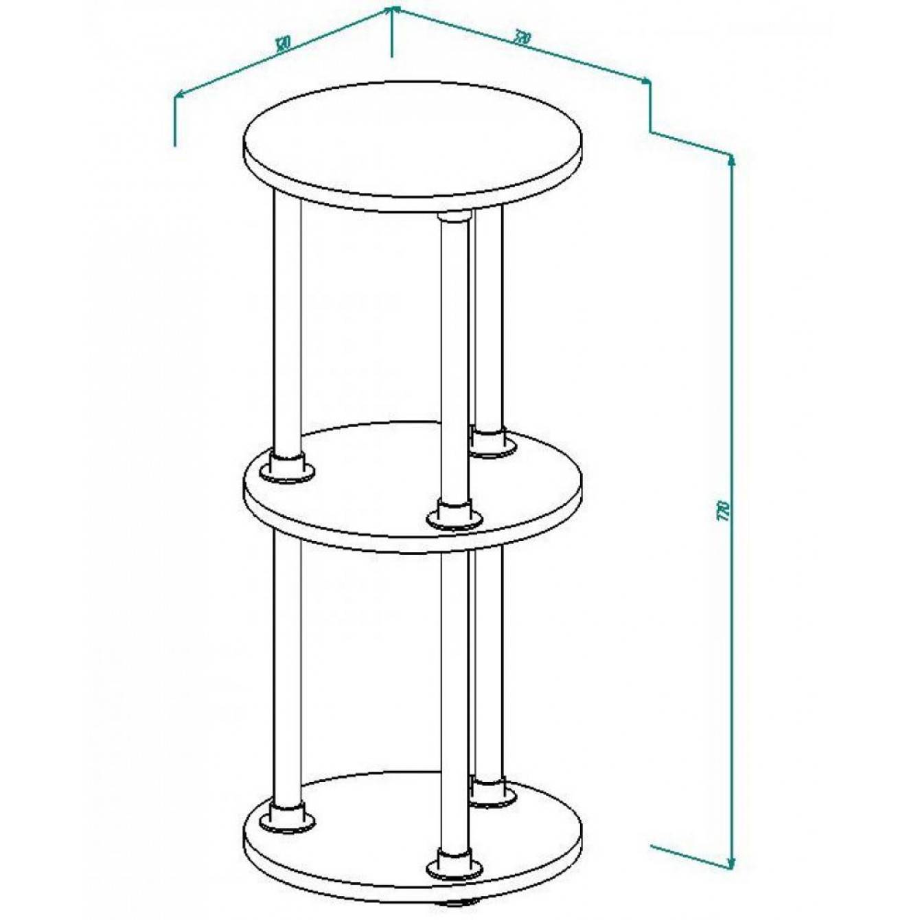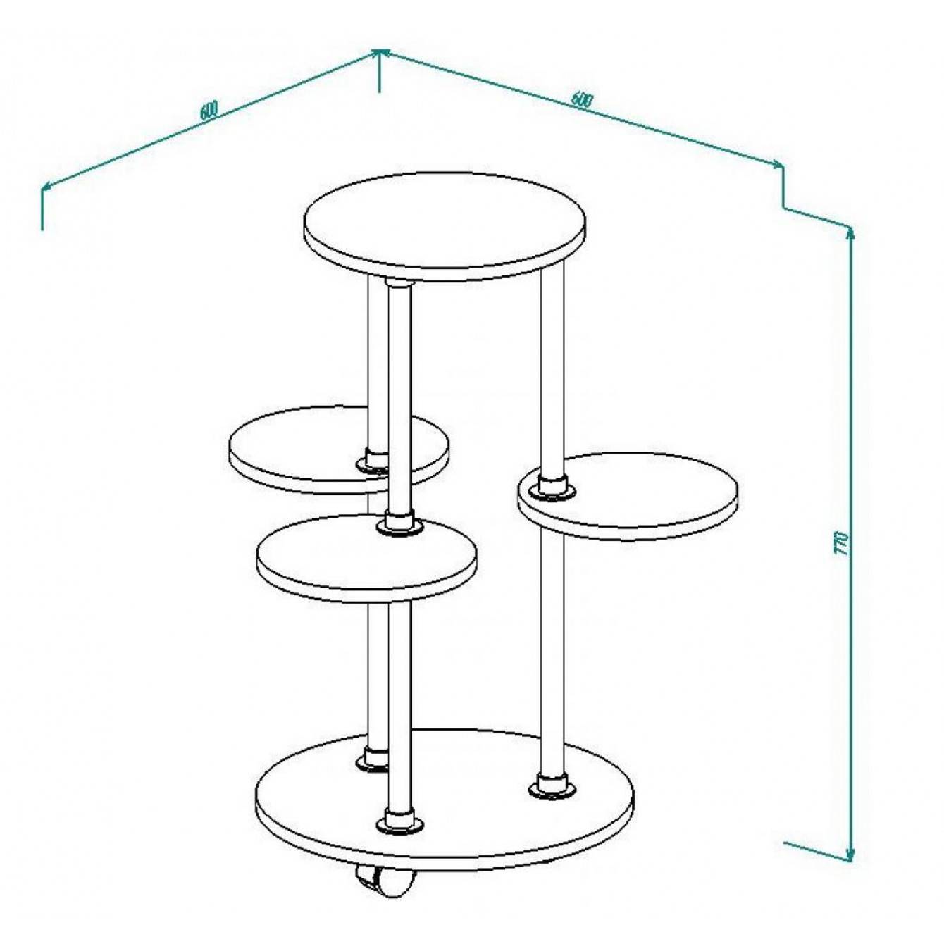 Основными составляющими такой полки выступает напольная платформа с четырьмя ножками, на которой зафиксированы стойки, изготовленные из хромированных труб. Эти стойки удерживают четыре полки, расположенные на разной от пола высоте.