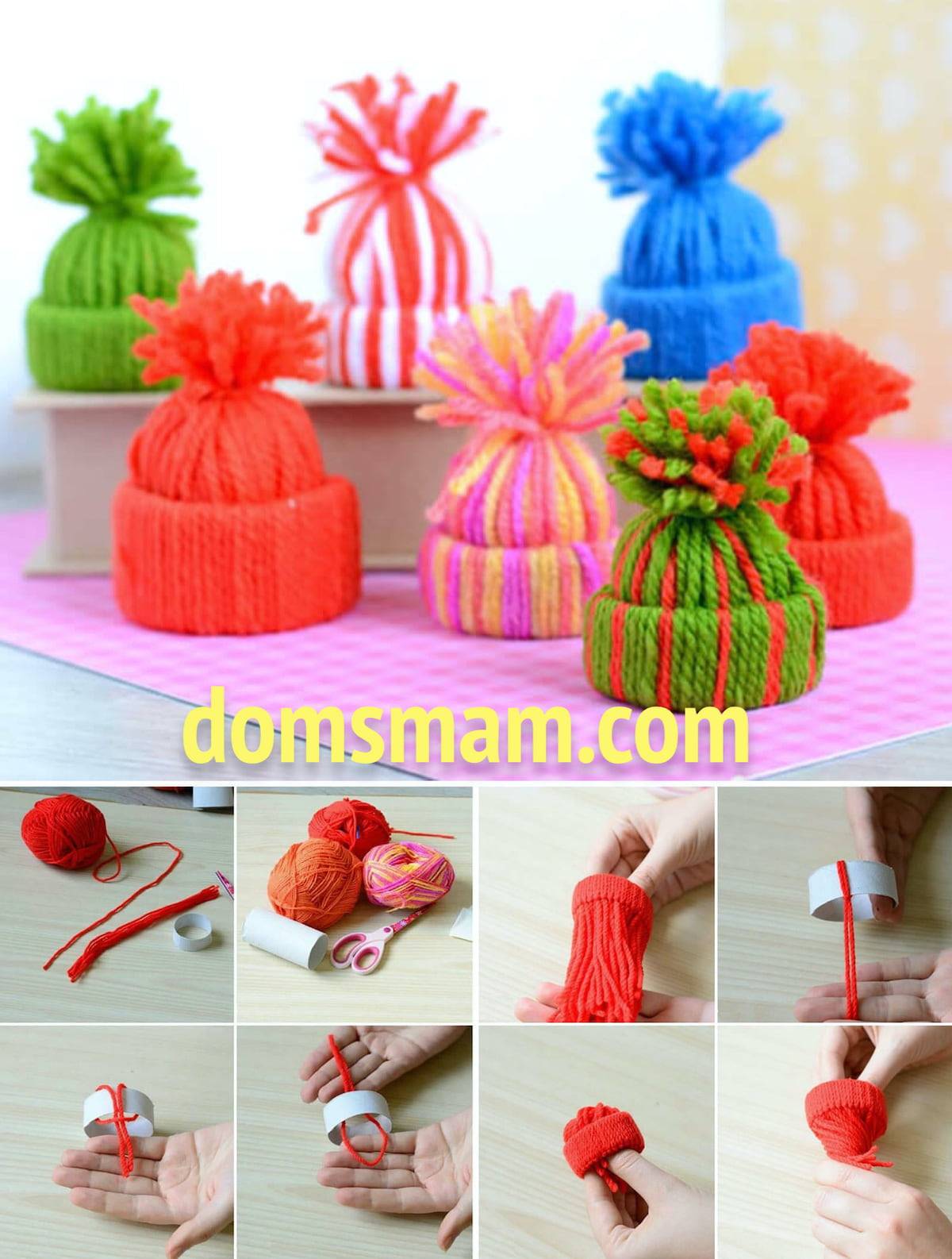Из остатков пряжи и картонного кольца вместе с детьми несложно сделать очаровательные шапочки, которые послужат украшением окна, полки, стены, елки.